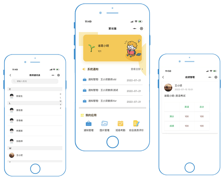 實現(xiàn)數(shù)字化辦公,對外向?qū)W生家長提供各種服務(wù),如:消息通知、請假管理,校園活動,學(xué)生動態(tài),教師通訊錄,學(xué)生定位等各種服務(wù)。對內(nèi)向教師提供各類服務(wù),如:班級管理,考勤管理,請假管理,活動管理,課堂點(diǎn)名,家長會管理,教師課程等等各種服務(wù)